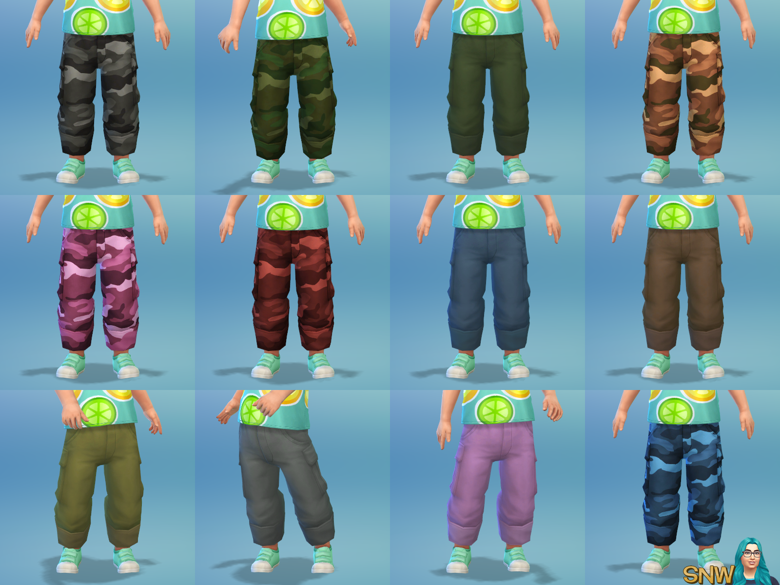 The long trousers on the left come in 12 colour options. It's a mix of plain coloured trousers, and camouflage/army trouwsers. The shorts on the right also come in 12 colour options. Half of them are plain coloured, the other half are checkered.